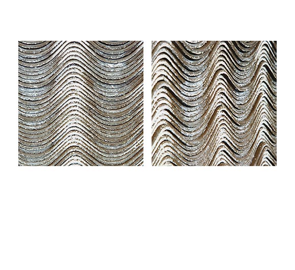 Es sind zwei fotografische Sichtweisen auf einen verwitterten und vergessenen Eternit-Plattenstapel auf einer Nordsee-Insel. Die Motive sind Grundelemente für großformatige Foto-Installationen. Die auf Holzplatten geklebten Einzelteile fügen sich auf einer Wandfläche zu immer wieder veränderbaren Verläufen zusammen.
